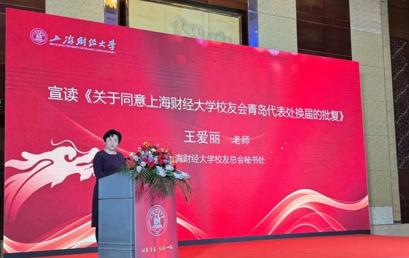 上海财经大学校友总会秘书处王爱丽老师宣读《关于同意上海财经大学校友会青岛代表处换届的批复》。