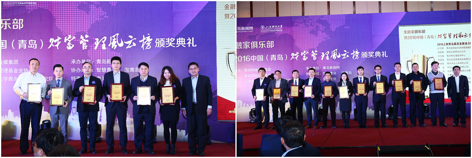 此次2016中国(青岛)财富管理风云榜的评选本着公开、公平、公正的原则,评选出了2016年度金融科技领先银行、最佳财富管理银行、最佳综合服务银行、十强证券营业部、互联网金融最佳口碑奖等17个奖项,全市共有50余家金融机构获奖。此外,我院的学员关皓骋、冷言成、李逢友、李宏钰、李迅、刘晶、马玉涛、王宏涛、尹磊、张文庆、周璐获得“2016上财青岛最具发展潜力财富管理人才奖”,何立波、李可佳、张辉、张焱、朱余华、 逄锦逢获“2016上财青岛财富管理杰出人物奖”。