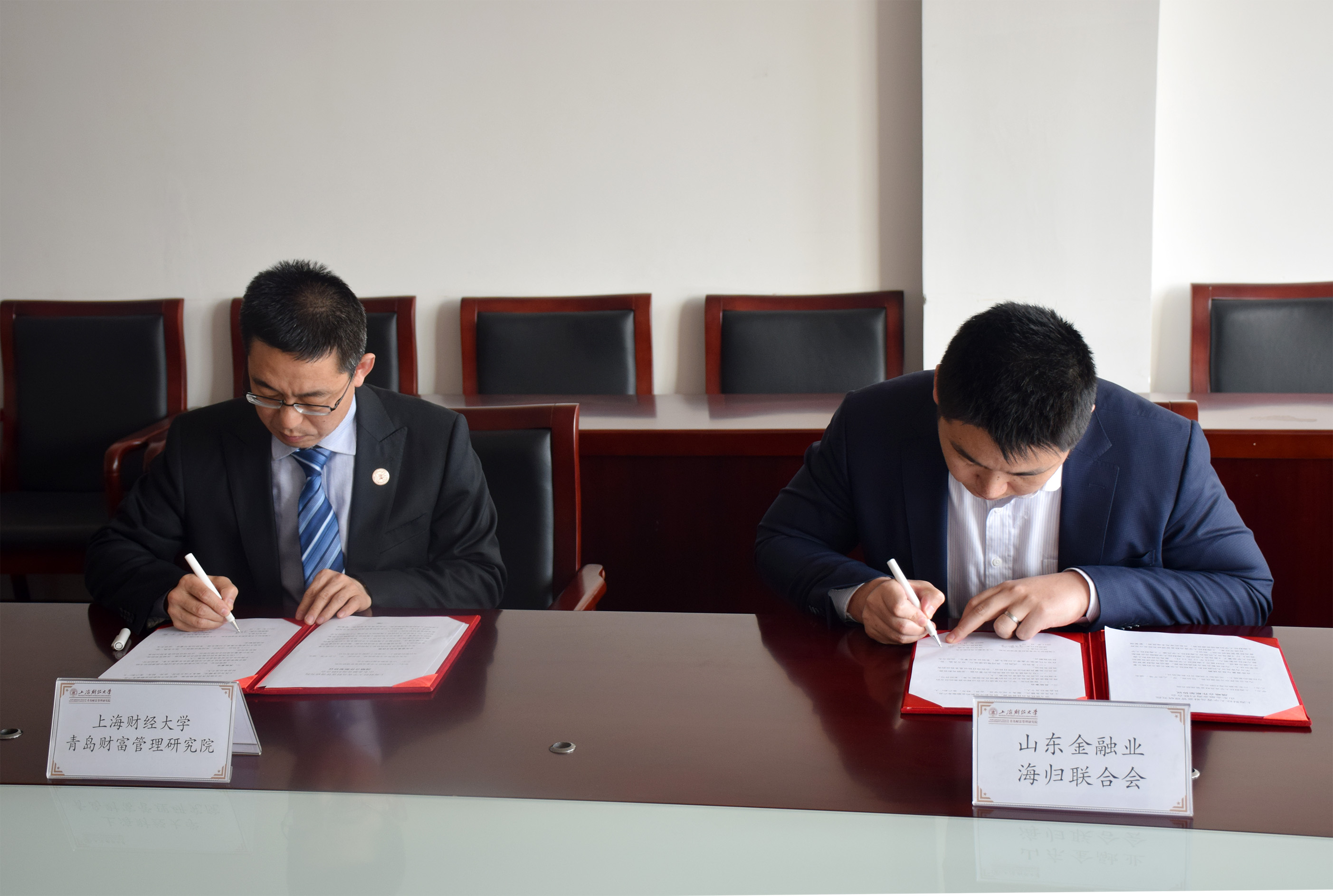 我院直属党支部书记孙燕堂与山东金融业海归联合会副会长崔永良代表双方签署了战略合作协议,上海财经大学青岛财富管理研究院品牌公益中心主任胡雪宁与山东金融业海归联合会秘书长李星佐等出席了签约仪式。