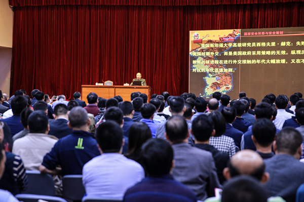 开学典礼结束后,原中国人民解放军国防大学战略研究所所长、中国科学院中国发展战略学研究会国防战略委员会专家委员金一南少将,向各位新生以及来自青岛市地方政府、金融机构、大型企业的四百余名嘉宾做了题为“新挑战,新机遇,新举措——国家安全形势与安全筹划”的主题演讲。