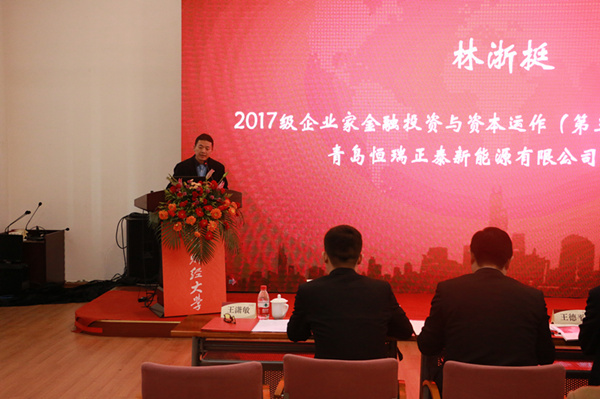 2017级企业家金融投资与资本运作课程班(第三期)副班长、青岛恒瑞正泰新能源有限公司董事长林浙挺代表老学员在开学典礼上发言。他说,包括新能源、高端设备制造业在内的新经济,对企业家的投资经验和金融知识都提出了更高的要求,要在了解、掌握金融制度创新的基础上,结合做好企业的产品创新和模式创新。同时,他希望新同学站在上财的新起点上,做一名终身学习者。