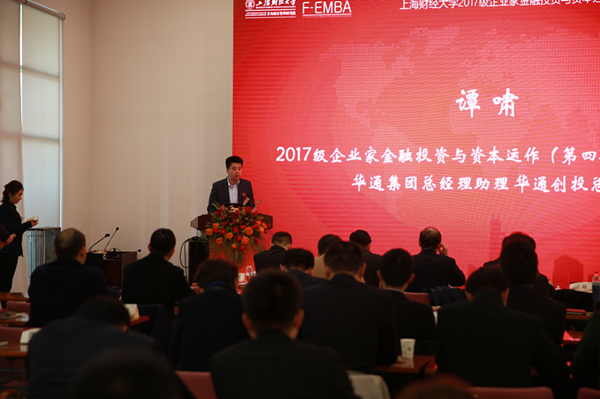 2017级新生、青岛华通创业投资有限责任公司执行董事谭啸代表新学员发言。他表示,上海财大有着深厚的金融文化和百年的商学底蕴,在经历商场和职场打拼后再入财大进行系统性学习是一个来之不易的机会,自己定会谨记“厚德博学,经济匡时”之校训,牢记金融之使命,不忘初心。