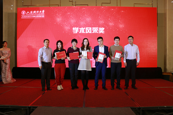 我院执行院长姜晖在年会中致辞,他从组织建设、制度建设、文化建设等方面总结概括了2017年上海财经大学青岛财富管理研究院的工作情况,并就上财百年校庆的相关情况进行了简要介绍。在接下来的颁奖礼中,姜晖、孙燕堂分别为本年度各班级中学术成绩优秀及做出杰出贡献的同学颁奖。