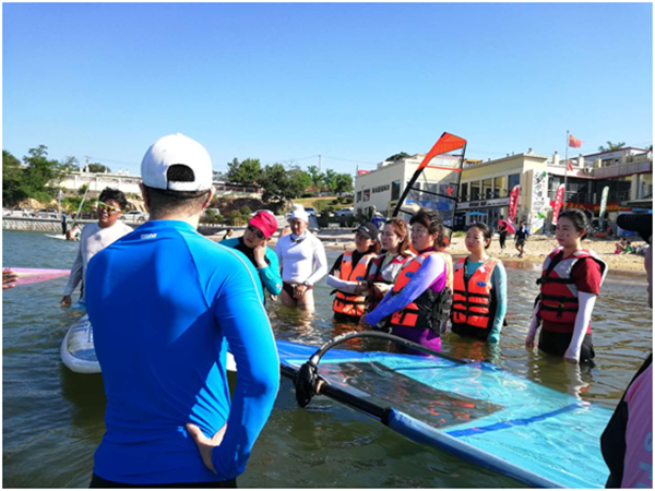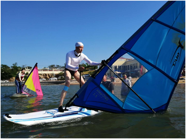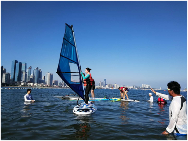“脚踏海浪,心随帆动”。8月11日下午,上海财经大学青岛校友帆船俱乐部在青岛第三海水浴场组织帆板体验活动。