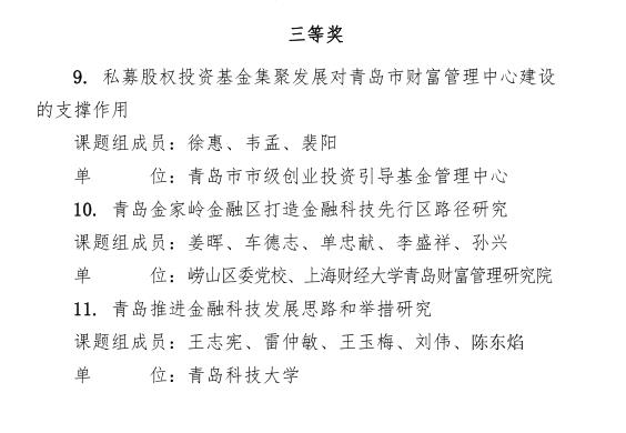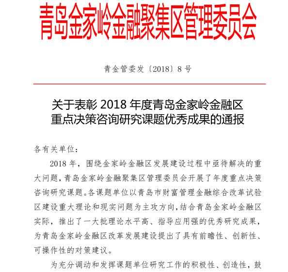 近日,青岛市金家岭金融区管委会通报了2018年度青岛金家岭金融区重点决策咨询研究课题优秀成果名单。我院与崂山区委党校联合申报的研究课题“青岛金家岭金融区打造金融科技先行区路径研究”获得优秀成果三等奖。上海财经大学青岛财富管理研究院执行院长姜晖主持与参与完成本次课题工作。