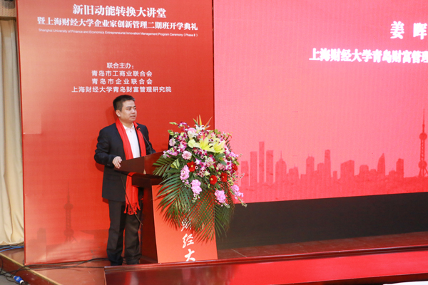 上海财经大学青岛财富管理研究院执行院长姜晖在致辞中,首先对各位新同学的加入表示欢迎和祝贺,他简要介绍了研究院落地青岛以来取得的成绩,并对企业家在当前环境下的应对举措提出了自己的建议。“在大家普遍感觉到的经济寒冬中,企业家要做到‘三要一不要’:即不要进入到自己不熟悉的领域,盲目投资和扩张;但要习惯于做别人做不到的事情,要在自己的企业中拥抱和植入互联网等新生代元素,要坚持终身学习,这才是企业家实现长期成功的重要因素。”