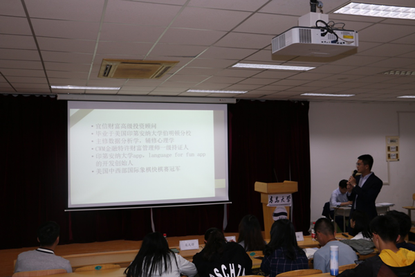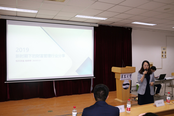 随后,恒天财富资深理财经理、CISI财富与投资管理国际资格证书持证人杨婷婷,为同学们带来了“新时期下财富管理行业分享”的主题演讲。演讲中她结合自己的工作实践,向在场大学生们介绍了目前中国的财富管理行业现状、理财师们的工作优势和职业发展,这也让同学们更具体地了解了理财师工作的实际情况。